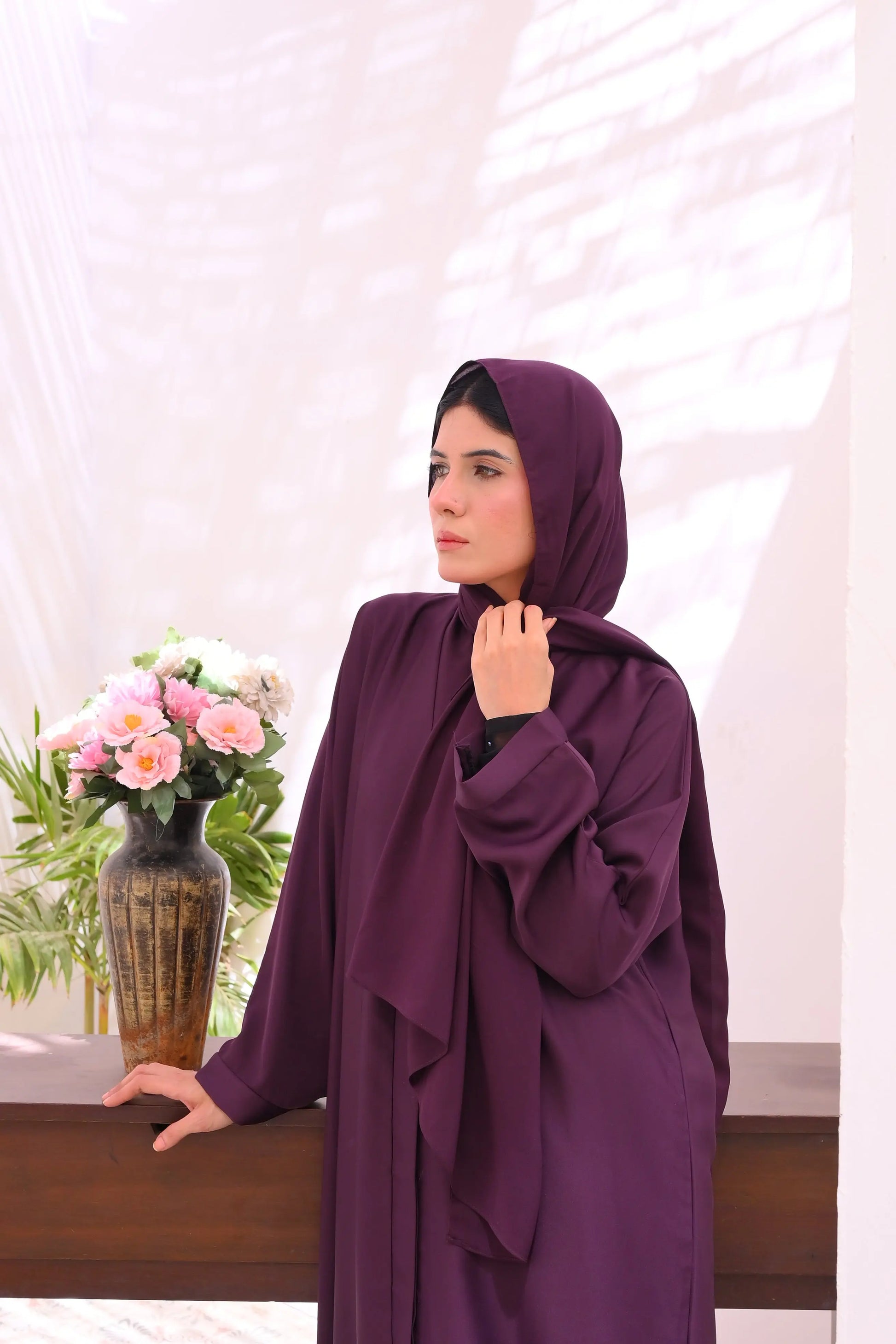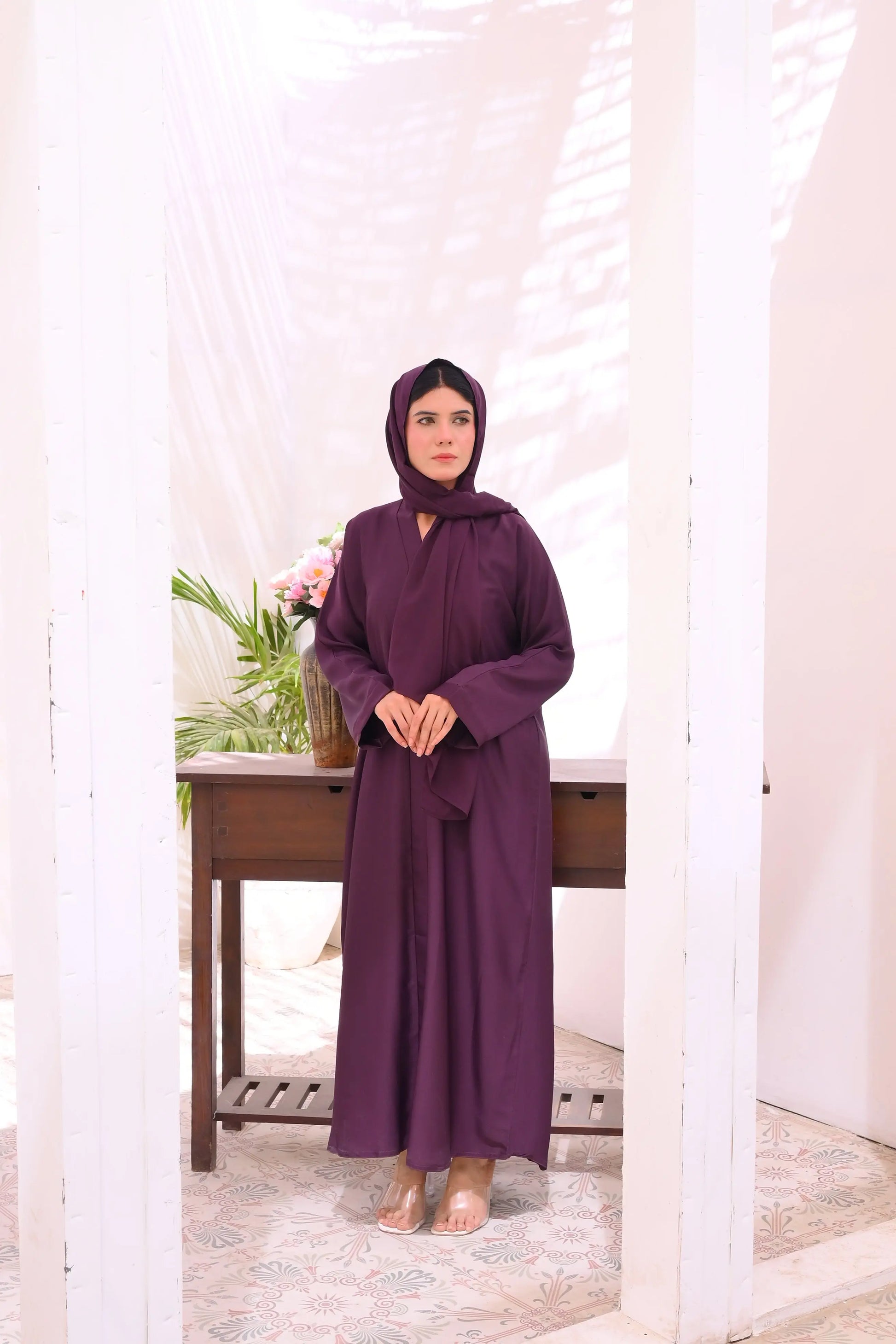Wrapped in luxury and tradition, the Gul Abaya is where modesty meets timeless elegance. Designed in a rich purple hue, its front-open style offers effortless sophistication, while the premium Nidha fabric drapes beautifully for a graceful silhouette. To complete the look, we've included a matching Korean Chiffon Sheila, adding a touch of refinement to every step you take. Available in various lengths and sizes, Gul is perfect for Ramadan gatherings, Umrah travels, or everyday elegance. Step into grace and confidence today!