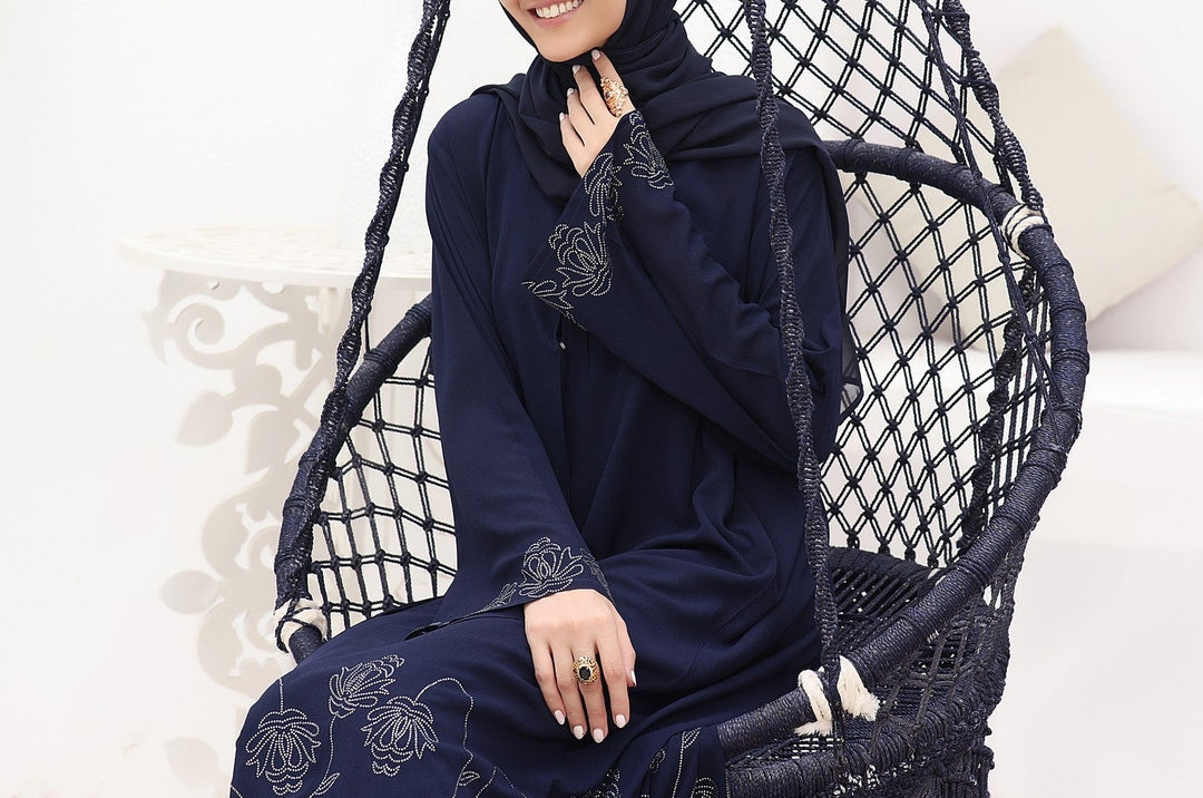 Crafted from the finest Nidha fabric, this abaya redefines luxury with its unparalleled softness, feather-light drape, and exquisite flow. Renowned for its buttery-smooth texture and elegant fall, Nidha fabric offers a regal comfort that moves with you effortlessly. Dyed in a rich, deep blue inspired by precious gemstones, this Abaya radiates sophistication while maintaining modesty with grace. Every stitch reflects master craftsmanship, creating a silhouette that flatters without compromising on comfort. Perfect for both grand occasions and everyday elegance, this is more than an abaya—it’s an heirloom of style, culture, and refinement.