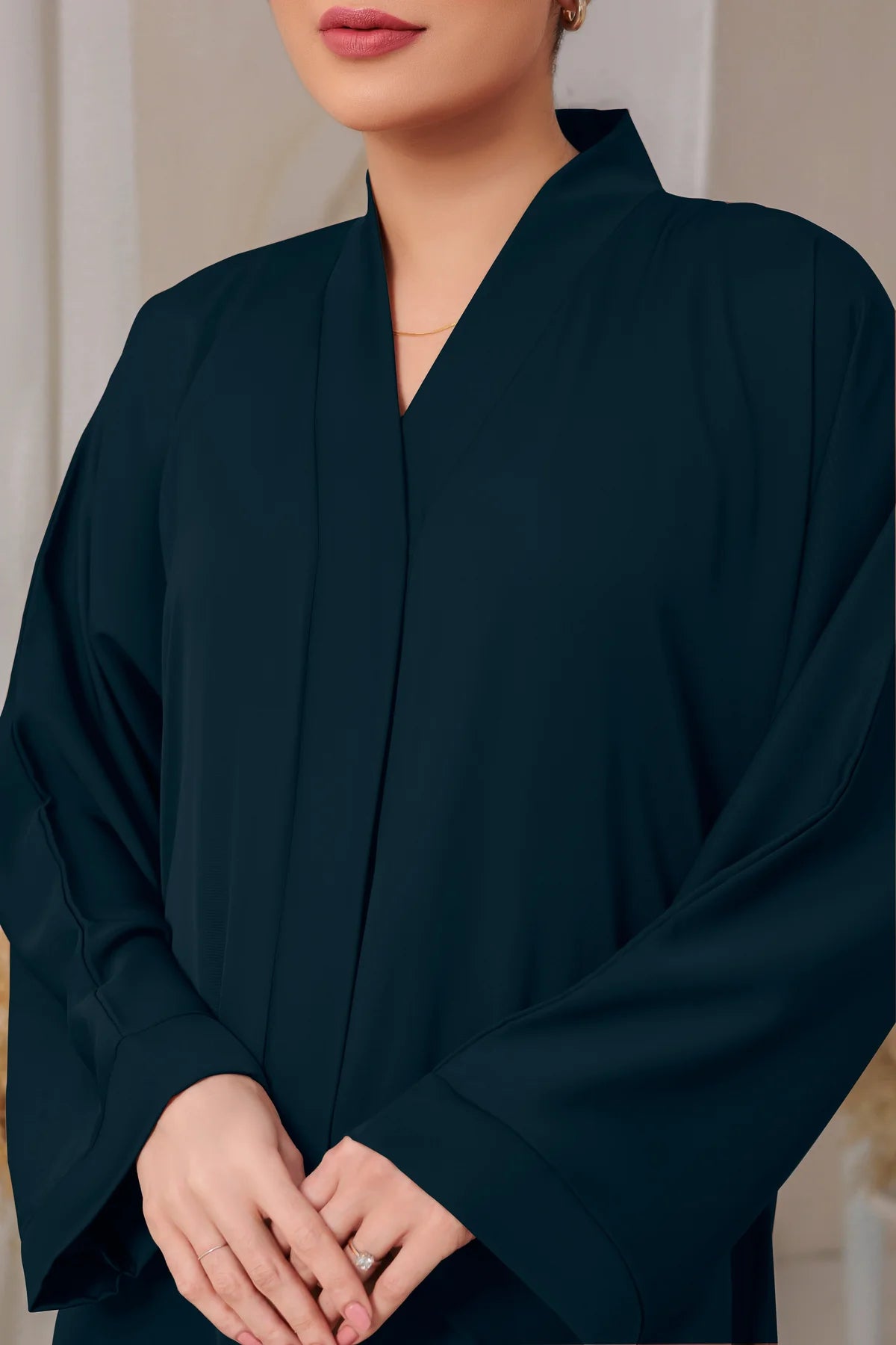 A showstopper in every sense – our bestselling front-open abaya in a stunning teal blue is a must-have for your wardrobe. Crafted with precision in premium Korean Nidha fabric, it features a relaxed silhouette with loose sleeves and is paired with a matching chiffon Sheila. The vibrant color and graceful design make it a perfect choice for modern modest fashion lovers.