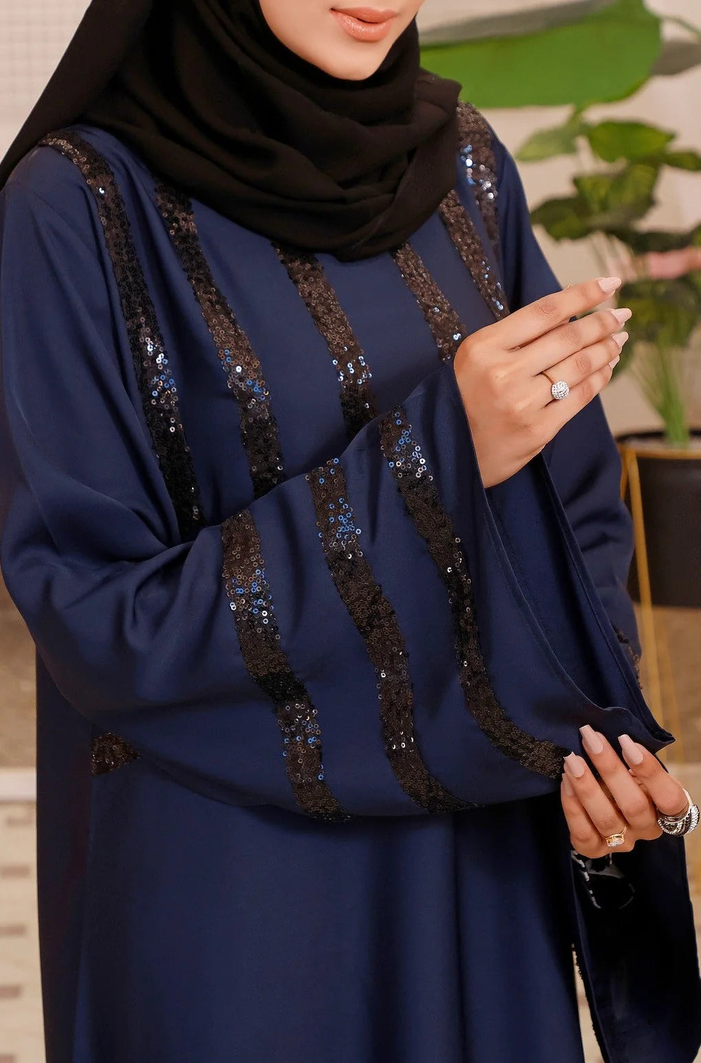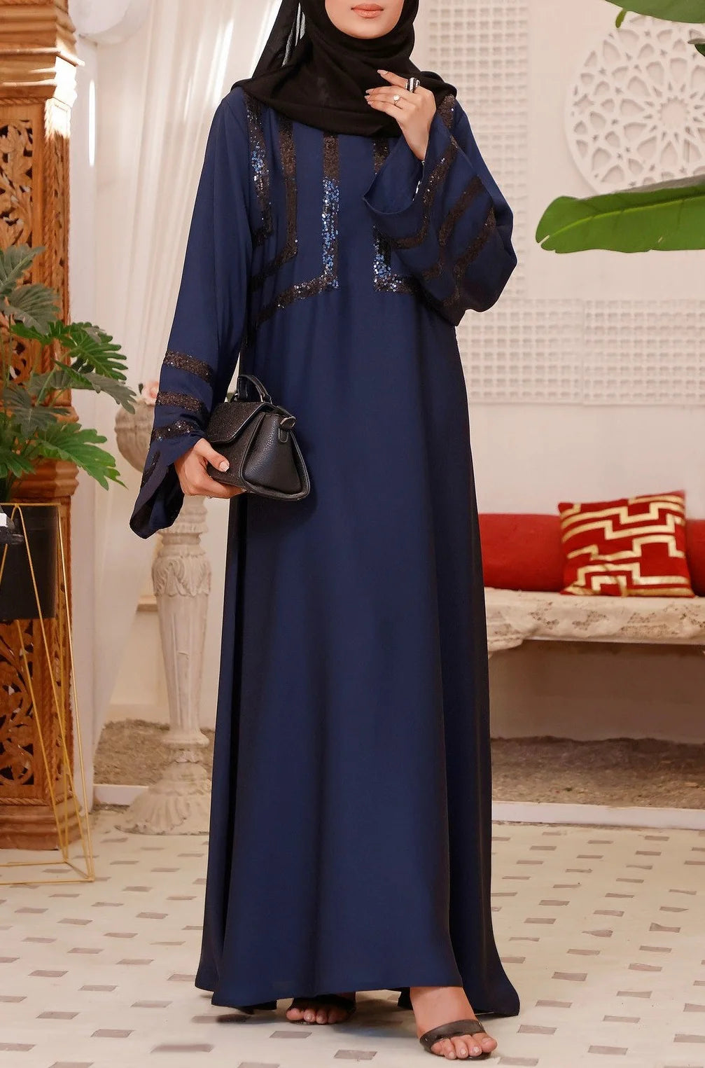 Step into elegance with our front-closed maxi-style abaya, designed to add a touch of grace to your everyday look. The delicate sequin detailing on the front and sleeves enhances its beauty, making it effortlessly stylish. Paired with a luxurious black Korean Sheila, this abaya is perfect for any occasion.