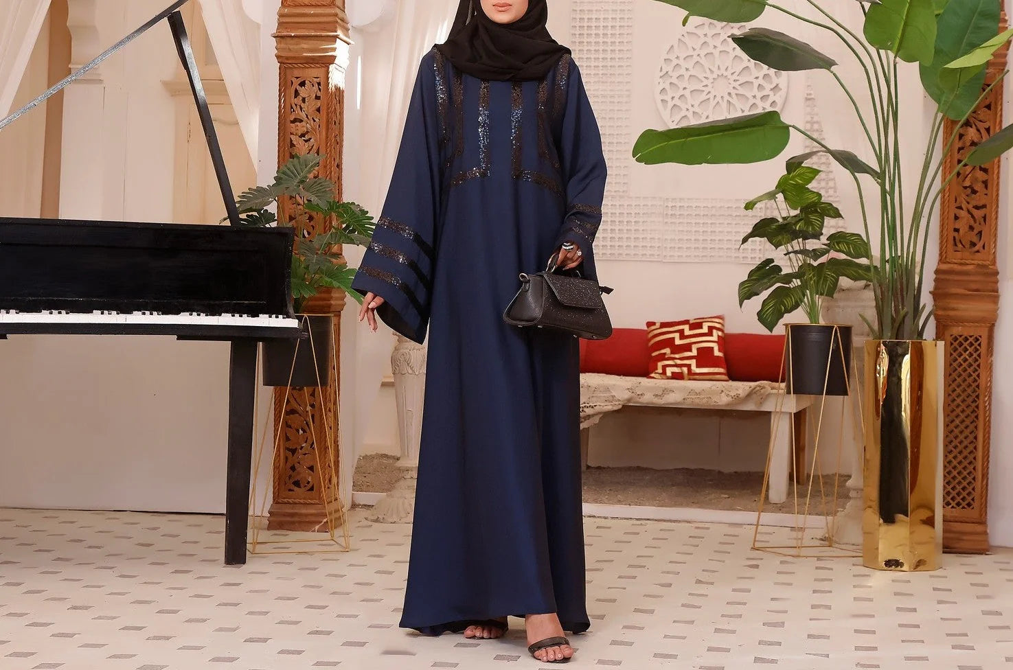Due to lighting and screen settings, the actual color of the product may vary slightly. The listed price includes the Abaya, Kimono, Waistcoat, or Prince Coat only. Accessories shown in the photos—like scarves, slip dresses, trousers, clutches, and pocket squares—are for styling purposes and not included.