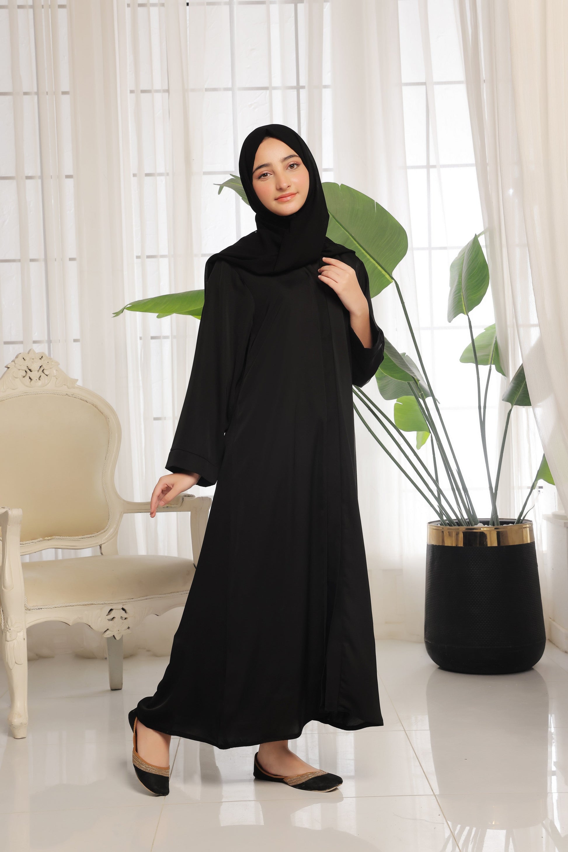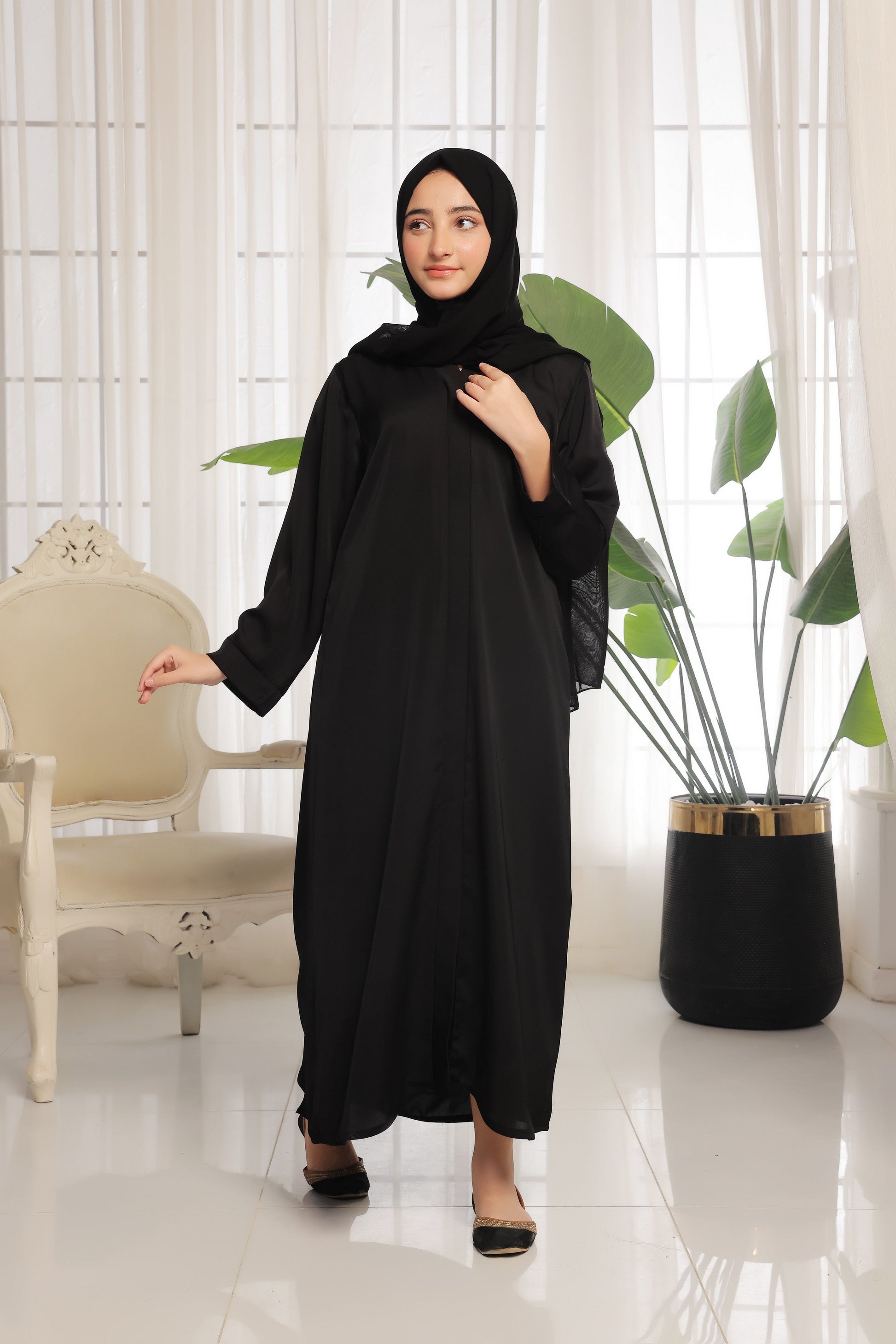 This is a must for your wardrobe collection with our new latest colors which is breathtaking and ultimately gorgeous which is our hot sellers these days front open style abaya and loose pattern sleeves come along with pure Korean chiffon Sheila