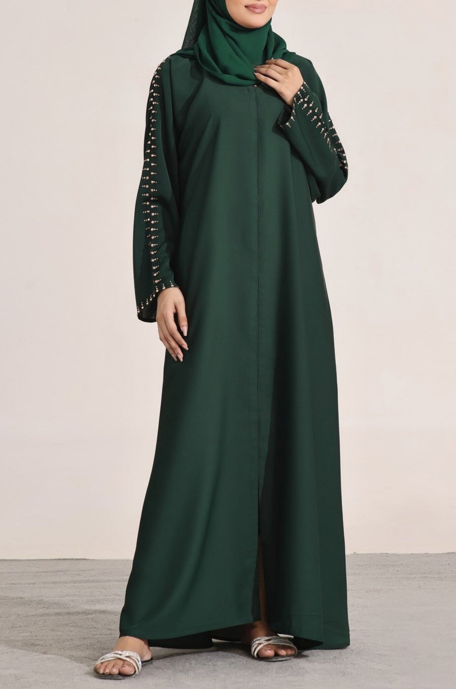 Featuring delicate details and a flawless finish, this abaya is a perfect blend of simplicity and refinement. Pair it with your favorite accessories or wear it on its own for a look that speaks volumes with grace and confidence.